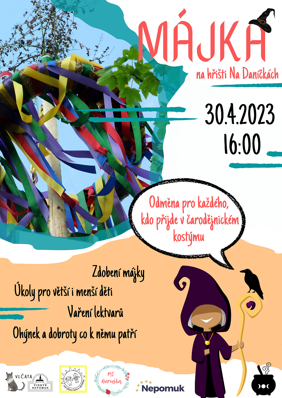 Zveme všechny malé i veliké čarodějnice a čaroděje na zdobení májky, oheň, čarodějnickou zábavu a plnění úkolů spojených s jarem. Odměna čeká pro každého, kdo přijde v čarodějnickém kostýmu, tak se moooc těšíme na každého, kdo dorazí.Něco dobrého k jídlu a pití na ohýnek bude zajištěno, doporučujeme si vzít svůj hrneček nebo plecháček na čaj. Začínáme 30.4.2023 v 16:00 na dětském hřišti Na Daníčkách. Akci společně připravují dobrovolníci z MC Berušky, Pionýrské skupiny Vlčata a Mateřské školky Nepomuk. Naše májka je součástí celorepublikových Dnů dobrovolnictví - rádi všem zájemcům vysvětlíme a ukážeme, co, jak a proč děláme a zájemce do příprav zapojíme. https://dnydobrovolnictvi.cz/