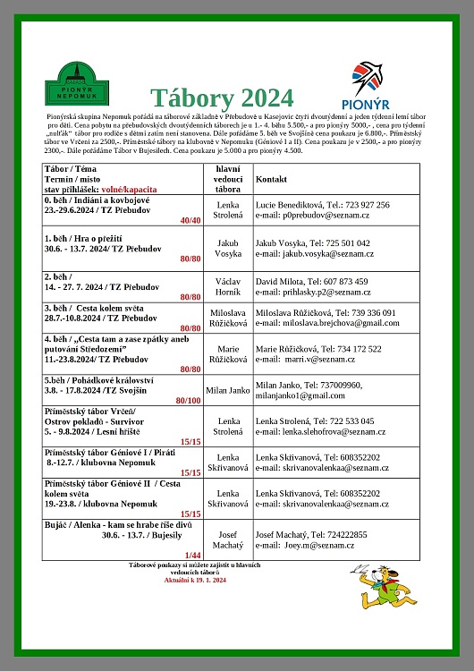 Pionýrská skupina Nepomuk připravila pro léto 2024 šest táborových běhů, tábor rodičů s dětmi a tři příměstské tábory.. O přihlášky na tábory si můžete napsat nebo zavolat na kontakty uvedené v letáčku.Letáček v pravé části menu nebo po rozkliknutí nadpisu.