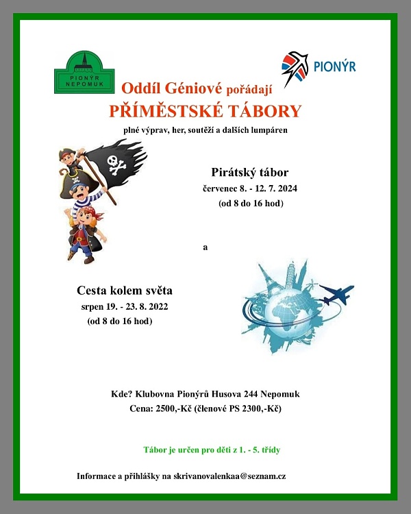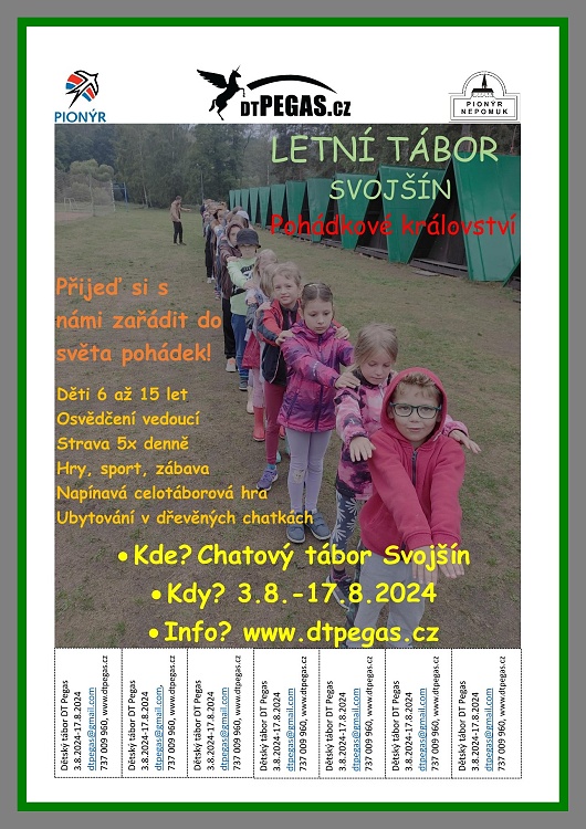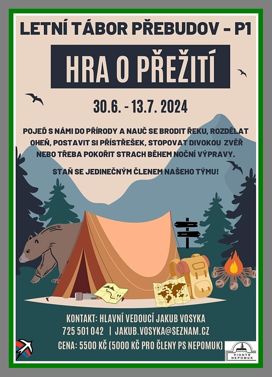 Pionýrská skupina Nepomuk připravila pro léto 2025 šest táborových běhů, tábor rodičů s dětmi a tři příměstské tábory.. O přihlášky na tábory si můžete napsat nebo zavolat na kontakty uvedené v letáčku. img
