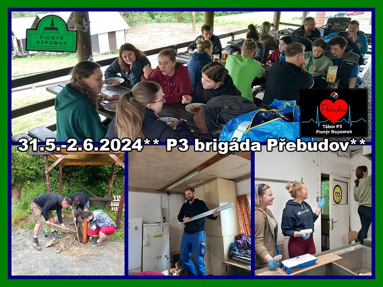 Brigáda P3 31.5.-2.6.2024 I když nám počasí vůbec nepřálo, stihli jsme toho za letošní brigádu opravdu hodně: vymlaovali jsme kuchyň; zbrousili, znovunatřeli a připojili koryta k odpadu; natřeli jsme kadibudky, vyměnili světla v klubovně a skladu a vysekali roští podél celé příjezdové cesty. Kromě přípravy základny na hlavní sezonu jsme se věnovali také teambuildingovým aktivitám a měli jsme programovou poradu k blížícímu se táboru.**MiloR
