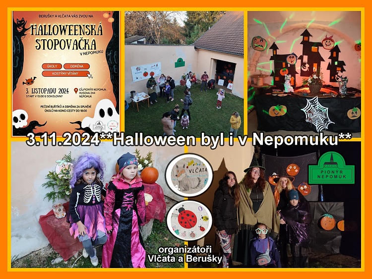 Letošní Halloween byl opět ve znamení strašidelných kostýmů, tentokrát jsme ale připravili 29.11.2024 pro děti v Nepomuku stezku, na které malí i větší účastíci plnili různé úkoly. V cíly trasy byl připraven poslední úkol - najít svoji halloweenskou odměnu a pak se ohřát u telpého čaje s možností opékání špekáčků. Trasy byly vhodné i pro kočárky, počasí se vydařilo a nás těší, že Vás přišlo opět mnoho a akce se líbila. Děkujem mockrát za přípravu všem, kteří se na akci podíleli a spěciální poděkování patří Mírovi Dvořákovi, za ochotu a energii, se kterou nám stále pomáhá.Akce Vlčata a Berušky.