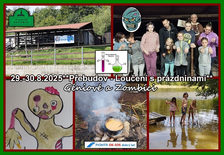 Géniové se rozloučili s prázdninami na Přebudově o posledním víkendu prázdnin( 29.-30.8.2025). Ihned po příjezdu na nás čekalo nemilé překvapení - na tábor byl zákaz vstupu. Naše zvědavost byla silnější, a tak jsme zákaz porušili. Na dveřích u jídelny byl pro nás vzkaz ze záhrobí, ať rychle utečeme, je-li nám život milý. Společně jsme se rozhodli, že zůstaneme. Ubytovali jsme se, uklidili jsme okolí tábora, kde byly rozházené odpadky. Odpadky jsme roztřídili do připravených pytlů. Počasí nám překazilo naše plány, a tak jsme si pustili dokument o recyklaci. Ráno bylo velké překvapení, opět byly odpadky po celém táboře. Po snídani jsme tábor uklidili a bylo nám jasný, že ten bordel dělá, ten, kdo nás tady nechce- Zombíci. Rozhodli jsme se, že budeme proti nim bojovat, a tak jsme se pustili do stavby bunkrů. Oběd jsme si šli uvařit do lesa. Bylo po dešti a rozdělání ohně nebylo moc snadné, ale nakonec se podařilo. Během čekání na polévku jsme se dali do poznávání stromů a rostlin v okolí. Polévka se nám podařila. Po setmění se ze všech stran na nás valili Zombíci, začala bitva o život. Po dlouhé bitvě se dali Zombíci na ústup a nám bylo jasné, že přijdou zase**LenkaS
