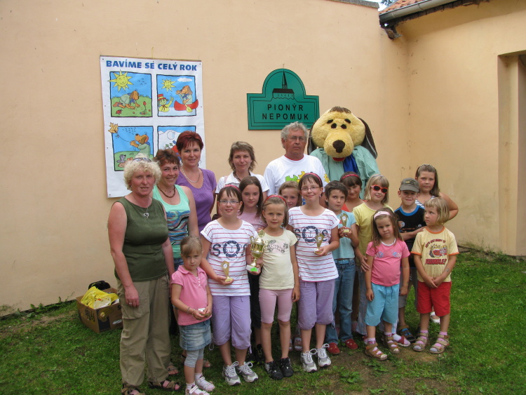 Na dvorku naší klubobvny se sešlo 42 zástupců ze šesti oddílů pionýrské skupiny. Nejaktivnějším pionýrům předal náš maskot pes plakety Pionýr 2011. Putovní pohár pro nejlepší oddíl získal Pusík, vedený Alenou Březákovou. Nezapomněli jsme poděkovat našim vedoucím a iinstruktorům. Nové červená trička jim moc slušeli. Děti jim pak blahopřály až je málem umačkaly. Po té byla připravena poznávací soutěž na nepomuckém náměstí. Úkoly  děti zvládli výborně. Nejvíce ohlasů získalo stanoviště ve spořitelně. Odměnou za soutěž byly opečené párky a pionýrská taška sladkostí. Více obrázků najdete ve fotkách v červnových akcí. Podívejte se.