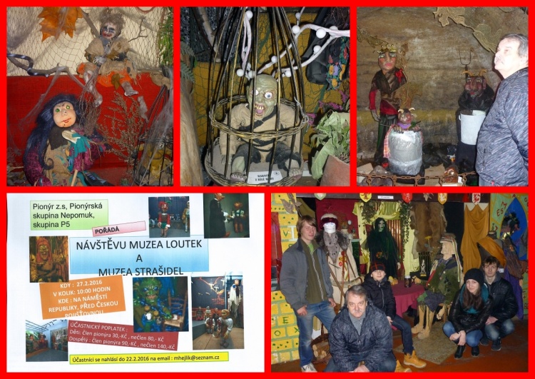 V sobotu 27.2.2016 uspořádala pionýrský klub P5 návštěvu Muzea strašidel a Muzea loutek v Plzni. Akce se účastnili dva dospěláci a čtyři děti. V sobotu jsme se sešli v 10:00 hodin na náměstí u České spořitelny. Odtud jsme vyrazili do muzea strašidel. V přízemí muzea je ukázka létajících košťat, ježibab a dětský koutek. Odtud jsme přešli do podzemí, kde nás přivítaly výkřiky strašidel. Po dokončení prohlídky Muzea strašidel, jsme přešli do Muzea loutek. V třípodlažní budově jsme si prohlédly loutky, maňásky, ale i tvorbu. Ve třetím patře jsme si mohli vyzkoušet i zahrát divadlo s loutkami. M.Hejlík