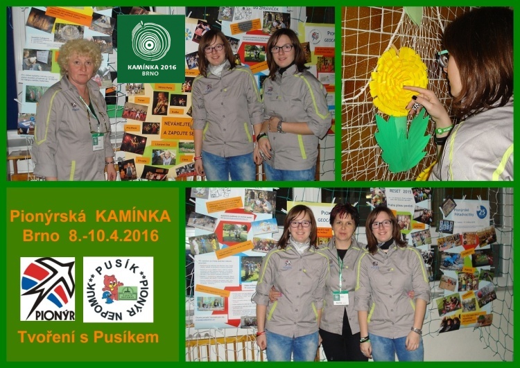 Do Brna na Kamínka 2016 s výtvarnou dílnou odjely děvčata z našeho oddílu Pusík. Vedoucí Alena  a Monika. Pomáhaly jim pionýrky Jana a Ela. Během dílny si mohli účastníci vyrobit tři dárky - jednoduchou knižní vazbu - Knížka pro radost, peněženku z Tetra Paku, srdíčko třikrát jinak - šité, proplétané a z papírových ruliček. Součástí dílny byla malá výstavka našich výrobků (výrobky a nástěnky) spojená s možností obkreslení šablon na různé výrobky - dárky, které lze vyrábět během roku k různým příležitostem. Hodnocení našeho tvoření můžete najít na fotografii, kde jsou účastnické lístky s hodnocením naší dílny. Děvčata  také zašla na další výtvarné díly a určitě přivezly nové náměty pro naše tvoření.