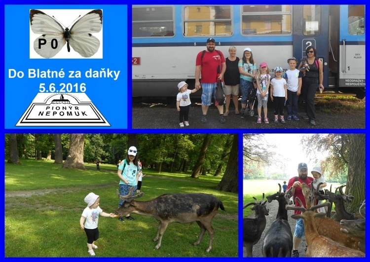V neděli 5.6.2016 ráno sesešel náš pionýrský Nulťák na Nepomuckém nádraží a vyrazili lokálkou směr Blatná. Cesta pěkně ubíhala, děti zpívaly a pozorovaly krajinu. I pro dospěláky to byl pěkný zážitek. Někteří nejeli vlakem již pěkných pár let. V Blatné jsme se vydali směrem zámek. Cestou přes park jsme pozorovaly divoké kachny a pak se nám přímo na cestičce k zámku ukázalo stádo daňků. Vůbec z nás neměli strach. Stačilo zašustit igelitkou, kde jsme měli sušený chleba a rohlíky a daňci za námi běhali jako pejsci. Měli nádherně semišové parůžky. Ještě se objevilo pár kachen a sebraly drobky ze země. Pak jsme posvačili a děti si zasoutěžily za sladké odměny. Ještě jsme si prohlédli pávy. Nejvíce se nám líbil bílý páv. Prohlédli jsme si zámek a pak jsme se přesunuli do cukrárny na toustík a nějaké ty sladkosti. Byla to mňamka. Ještě jsme se osvěžili u fontány a šli na vláček, který nás dovezl zpátky domů. Cesta byla veselá. Děti dostaly ještě nějaké sladkosti a hlavně vymalovávací diplom za splnění cesty.Byla to krásná neděle. Ani se nám nechtělo na nádraží rozloučit. Těšíme se na další výlet. *Za P0 Martin Běle