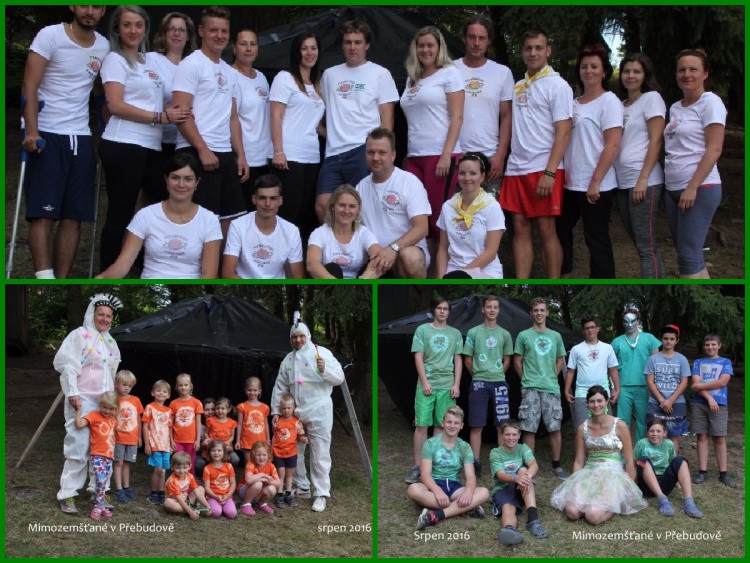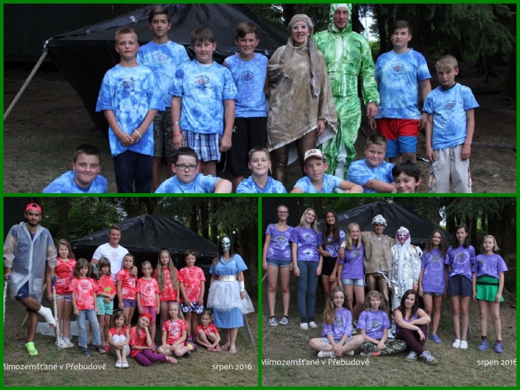 Tak už je to tady.... 14. srpen 2016 se přiblížil a to bylo datum našeho příjezdu na tábor Přebudov. Dospěláci i malý táborníci byli nedočkaví a natěšení, čekající nové kamarády a dobrodružství. Po příjezdu všech táborníků jsme si prošli tábor a zjistili vše důležité – co kde a jak.... V rámci seznamování jsme si došli do lesa na dříví, abychom mohli večer opéct buřty k večeři. Po svačině nám Majda – naše hlavní vedoucí představila zbytek osazenstva a přečetla táborový řád a režim dne. Na nástupu jsme se dozvěděli, že celotáborová hra začne po setmění. Když už bylo hodně velké šero, začala na hřišti svítit a blikat kosmická loď a to byla známka toho, že se začíná něco dít. Majda nám oznámila, že musíme začít vyvolávat mimozemšťana, který nás bude celých 14 dnů pobytu provázet. A v tom se to stalo..... Z kosmické lodě vystoupil mimozemšťan Ťa Fun z planety Fudža fuč a představil nám celotáborovou hru. Poté nás požádal, abychom šli do lesa najít světla, která spadla z mimozemské lodě, když v Přebudově přistávala, kde bude napsán vzkaz, co se bude dít dál. A opravdu – vzkaz tam byl. . . Ráno jsme vyskočili z postelí, plni elánu, protože jsme věděli, co nás čeká. Prvním úkolem bylo, nabatikovat si trička a nažehlit logo letošního tábora. Odpoledne nás navštívil opět mimozemšťan Ťa Fun a vyprávěl nám o planetě Merkur a už pro nás připravil první úkoly – jízda s kárkou, chůze na novinách apod., abychom věděli, jak se na takové planetě pohybuje. V úterý, hned po snídani, nám mimozemšťan představil planetu Venuši a s tím opět další úkoly jako stavění stanu , střelba ze vzduchovky..... Odpoledne přijel pan fotograf, aby zvěčnil naše krásná trička a měli jsme všichni památku na tábor. Večer jsme si užili diskotéku pod taktovkou Bláži a Mušáka.... a srandovní soutěže pod taktovkou Kikiny a Dáni. Museli jsme jít spát za včasu, protože ve středu nás čekal výlet do Nepomuka do zábavného parku. Vybaveni svačinkou jsme si to po ránu štrádovali k Přebudovu, kde na nás čekal autobus. Moc jsme si to užili a po poledni zvládli navštívit ještě Nepomuk – někteří nákupy, někteří zmrzlinu, jiní dětské hřiště v Zeleném dole. Čtvrtek byl opět s mimozemšťanem a vyráželi jsme pro změnu na Mars. A protože Mars je rudá planeta, hned ráno si všichni oblékli červená trička a šli soutěžit. Po soutěžení jsme ještě prošli stanoviště, kde nám vedoucí vysvětlili, jak se používá morseovka, uzly, buzola, paní zdravotnice si nás vyzkoušela, co víme ze zdravovědy a hádali jsme kytky a stromy. Protože se na nás i letos usmálo sluníčko a počasí přálo, zkusili jsme po poledním klidu i koupání v rybníku, který je hned pod táborem. Po svačině k nám přijel pan Honzík z Hvězdárny z Plzně, který nám vyprávěl o sluníčku, mohli jsme se podívat ohromným dalekohledem a ptát se ho na to, co nás zajímalo. Pak jsme se přesunuli do slepičárny, kde udělal všeobecnou besedu o planetách a o nebi, co vše tam můžeme vidět. Večer, když už byla velká tma, šli velké oddíly pozorovat i noční oblohu. Bylo to velice zajímavé, i když pan Honzík říkal, že to není nic moc, že je úplněk.... Ale nám to vůbec nevadilo, vidět v dalekohledu měsíc v úplňku a krásný Saturn byl velký zážitek. V pátek dopoledne jsme si zahráli hru pro všechny „Šnek“. Odpoledne jsme se koupali a užívali si hezkého počasí. Na sobotu si pro nás vedoucí připravili Přírodovědnou stezku na Saturnu, aby zjistili, co si za týden pamatujeme z morseovky, uzlů, topografických značek, zvířat, rostlin, zdravovědy....  V denním programu bylo na odpoledne naplánováno překvapení, takže všichni napnutí co bude, jsme se nemohli dočkat. Vedoucí nás dovedli k rybníku a v tom na druhém břehu rybníka k nám na voru začal plout Neptun – vládce potoků, řek a studánek se svým černochem a vílami. Přijel si na náš tábor vybrat do své družiny nové členy. Ty, kteří ještě nebyli na našem táboře.       V neděli si s námi počasí trochu pohrálo, takže jsme museli Přebudovského predátora přesunout na odpoledne a dopoledne si zahrát naše oblíbené Bingo. Samozřejmě několik kol, aby si to užili všichni. Na večer jsme si domluvili promítání, které už nám dost chybělo. :-) V pondělí po snídani jsme si nabalili kotlíky, brambory, cibuli a chleba a vyrazili si do lesa uvařit polévku. Všem se povedla a moc si pochutnali. Po poledním klidu přijel pan Šipla z Blovic a mohli jsme si pro maminku vyrobit svíčku. V úterý se nám zjevil zase mimozemšťan Ťa Fun a představil nám planetu Neptun a dal nám úkoly na dopoledne – zahráli jsme si kuličkiádu. Odpoledne byla koupačka v rybníku a po svačině přijeli dobrovolní hašiči z Nepomuka a udělali nám pěnu, ve které jsme si pěkně zařádili. Středa se nesla na planetě Uran – opět jsme soutěžili na diplomy a odpoledne jsme nacvičovali představení na závěrečnou ufopárty, která měla být ve čtvrtek. Ve čtvrtek jsme doladili naše vystoupení, po polévce jsme se zaběhli svlažit do rybníka a po poledním klidu nás čekal poslední nástup. Majda s Markétou se s námi rozloučili, vyhodnotili, jak jsme si uklízeli ve stanech a v chatičkách, popřáli dvou kamarádům, kteří měli narozeniny a jako poslední přišlo na řadu vyhodnotit, jak jsme byli úspěšný v celotáborové hře. Všechny planetky, kde jsme 14 dnů trávili prázdniny, byli úspěšné – Ufofufo, Ufofialky z Ufofilie, Ufíci, Mrňouskova planeta, Winers i Vousáči. Postupně, jak jsme se umístili, jsme si chodili vybírat odměny. Po svačině už začala naše ufopárty. I vedoucí s