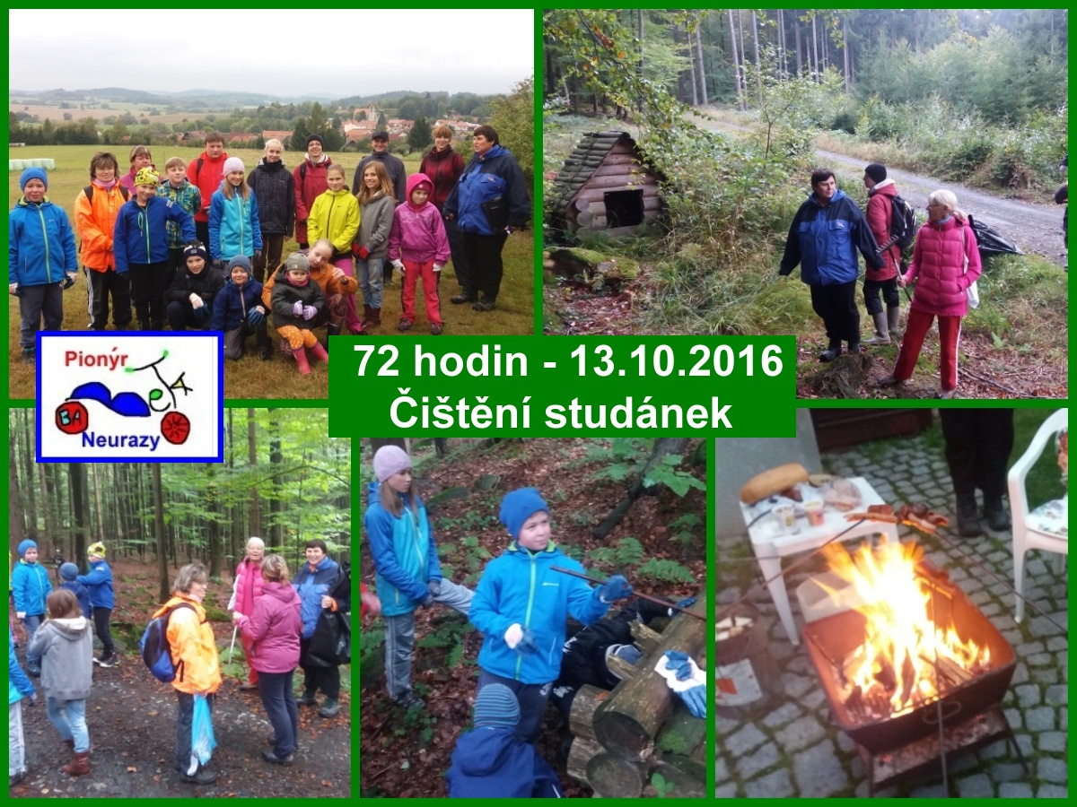 Babety se každoročně zapojují do projektu 72 hodin. Pořádáme sportovní soutěž, nebo jdeme čistit les a okolní studánky, někdy i obojí. Letos 13.10.2016 jsme vyrazili za studánkami. Společenská akce s ekologickým námětem byla moc fajn. Sešli se bezva lidi, děti opustily tablety a počítače a běhali v lese. Při zábavě sbíraly odpadky, vyčistili jsme 2 studánky a naplánovali větší opravy. U druhé studánky bylo studené občerstvení - hladu se neporučí. Zakončení proběhlo na jedné zahradě, udělal se oheň, opekl zbytek vuřtů, vytřídil odpad a skoro za tmy jsme se rozešli k domovům. Bohužel zakončili jsme úrazem (pak nevěřte na 13) a domů jsem jela přes chirurgii Klatovy a Pavlínka si přivezla sádru na pravé ruce. Je statečná a účast na VELKÉ NEURAZSKÉ 23.10.16 a 28.10.16 na LAMPIONOVÉM PRŮVODU si nenechá ujít. Tak Ahoj v Neurazech na dalších akcích.*MS