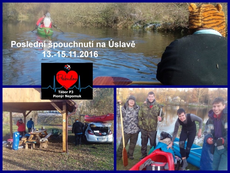 O víkendu 11. 11. - 13. 11. 2016 se uskutečnilo Poslední šplouchnutí na Úslavě, kterého se zúčastnilo 6 lidí. Účast proto byla nadmíru uspokojující, vzhledem k tomu, že se voda sjížděla v - 4°C. V pátek jsme všichni přespali ve Vrčeni pod širákem, odkud jsme ráno vyrazili směrem Blovice, kde jsme již po pěti hodinách obědvali. Poté jsme přespali u Lukáše Milforta, který s námi také absolvoval cestu. Zde jsme měli k dispozici i gril, a tak jsme si vesele v minusových teplotních hodnotách dělali maso na grilu. V neděli jsme tedy vrazili na závěrečnou část etapy, a sice Blovice - Starý Plzenec. Během této cesty jsme doslova proráželi ledy. Byla ale velmi zajímavá, jelikož jsme ji využili ke hře na kytaru, Prší a hraní dalších vedlejších her. Tímto bych chtěl poděkovat všem zúčastněným, že jsme se opět sešli na posledním, tentokrát listopadovém, posledním šplouchnutí, a doufám, že se všichni opět uvidíme v únoru na otevírání a že přibude alespoň jedna loď.*JB