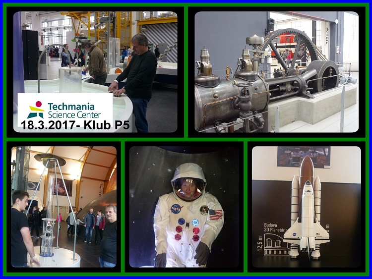 Techmania Science Center - Dne 18. března 2017 uspořádala skupina P5 návštěvu TECHMÁNIE PLZEŇ.V sobotu ráno nám nepřálo počasí. Sraz jsme měli v 10:00 hodin před Techmanií. Akce se zúčastnili dva dospěláci a jedno dítě. Po 10:00 hodině jsme zakoupili vstupenky, odložili bundy v šatně a začali s bádáním a prohlídkou. Zopakovali jsme si některé učivo ze základní školy, protáhli jsme si tělo, navštívili expozici Obnovitelné zdroje energie, vodní svět, 150 let průmyslu v Plzni, další a další atrakce. Naše putování skončilo v Planetáriu v expozici vesmír.Až na malou účast se akce vyvedla. Vřele můžeme doporučit návštěvu. *M. Hejlík
