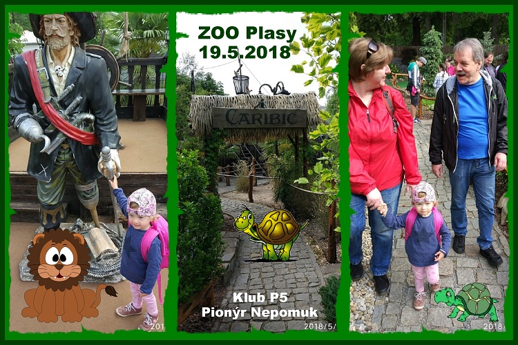 V sobotu 19.5.2018 uspořádal Klu P5, při Pionýrské skupině Nepomuk výlet do ZOO Plasy. Na akci dorazilo pět účastníků. V sobotu ráno jsme se sešli v 7:50 hodin na nádraží českých drah v Plzni. V 8:17 hodin jsme vyrazili motoráčkem směr Plasy. Cesta nám rychle utíkala. Měli jsme sebou malou cestovatelku, která nás bavila celou cestu. V 9:00 jsme dorazili do cílové stanice, Plasy. Pomalu jsme se přesunuli k ZOO. Zakoupili vstupenku. Plaská ZOO je spojená s mini golfem. Kdo chce, tak u toho si může zahrát mini golf, nebo jen si ZOO prohlédnout. ZOO Plasy je malá, ale po prohlídce jsme z ní byli nadšení, Vřele doporučujeme všem. Čas je náš nepřítel a tak se přiblížil čas návratu domů a tak se přesouváme zase na nádraží, kde na nás čeká motoráček s odjezdem 14:59 hodin, směr Plzeň. Akce končí, v 15:40 jsme dojeli do cíle, Plzeň hlavní nádraží. Akce se povedla i počasí nám přálo.* Miroslav Hejlík