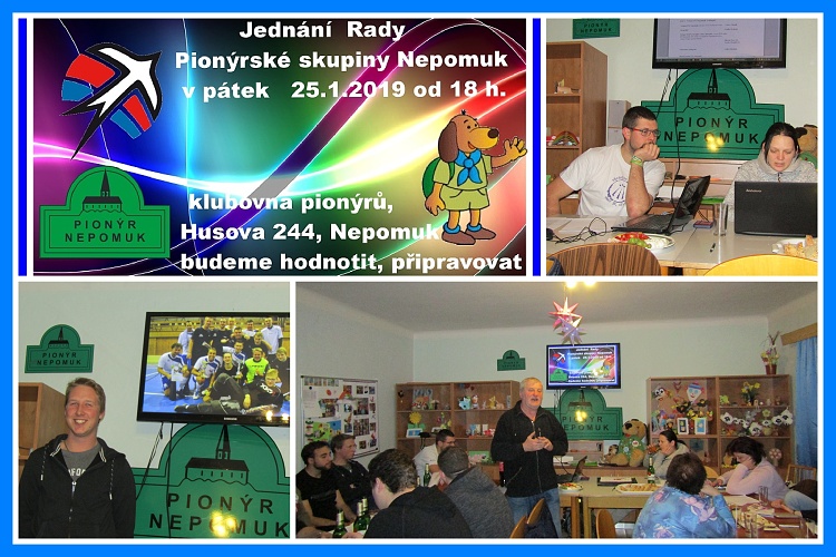 Jednání Rady Pionýrské skupiny Nepomuk se uskutečnilo v pátek 25.1.2019 na klubovně pionýra. Je to vlastně naše výročka, tak jsme hodnotili, připravovali a plánovali. Slyšeli jsem od vedoucího skupiny zprávu o činnosti za rok 2018. Dvě stě pionýrů v Nepomuku se celoročně činilo šest dětských oddílů (dva výtvarné, stolní tenis, 2 florbalové a jeden všeobecný). Pět táborových klubů během celého roku se schází na akcích, kde se baví, seznamují a zejména připravují letní tábory. O prázdninách připravili šest táborů, kterých se zúčastnilo 363 dětí a staralo se o ně 118 dospělých. V průběhu roku bylo připraveno 74 akcí pro členy a ostatní děti a mládež. Zapojili jsme se do charitativní akce Český den proti rakovině a na konto jsme zaslali částku 9128 Kč. Oddíl Pusík a Knoflíci se zúčastnil republikové výtvarné soutěže Sedmikvítek a získali šest ocenění.