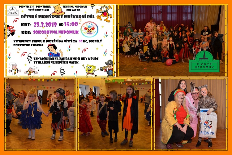 Dne 23.3.2019 se uskutečnil Dětský pionýrský maškarní bál. Letošní rok se sešlo okolo 45 dětí a spousta rodičů, babiček, dědečků, tetiček i sourozenců. Maškarní ples byl jako vždy v duchu zábavy, tance a her. Jako každý rok jsme si společně zatančili naše známé sestavy, které pravidelní účastníci bálu už znají a nový se je s chutí naučili. Dále na programu byly také hry, děti si zaházely s kroužky nebo zkusily balanci míčku na pálce, opět rozděleni do kategorie předškoláků a školáků. Pro děti také bylo připraveno tančení vystoupení skupiny 100% DANCE. Již tradičně bylo také vyhlašování nejlepších masek, pro letošní rok porotu nejvíce oslovila zvířátka, mohli jsme vidět krásné kuřátko, pandu, divokého tygra a také ježka. Děkujeme rodičům za skvělou přípravu svých dětí a za hojnou účast. Závěrem bych ráda poděkovala DJ Michalovi, který se postaral o hudbu, manželům Bělovým, kteří nám opět zapůjčili své táborové hry, abychom mohli soutěžit. Holkám z tančení skupiny 100% DANCE za vystoupení a pomoc při bále. Adélce Bělové za pomoc při organizování bálu. Fotografovi Honzovi, díky kterému máme vzpomínky na krásný bál. Klukům, kteří Vás uvítali u vstupu. Velké díky taky patří Kájovi Brejchovi, který zajistil sponzorské dary do tomboly a samozřejmě největší dík patří sponzorům, kteří nám umožnili pro děti dětskou tombolu udělat. **Karol Strychová