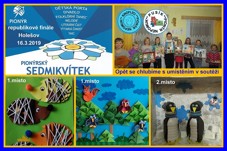Naše pionýrské oddíly Pusík a Knoflíci, zaměřené na výtvarnou činnost opět dokázaly, že pohár předsedy vlády ČR, který obdržely v únoru jim patří zaslouženě. Po dvou měsících se nám vrátilo naše tvoření z republikového finále výtvarné činnosti Pionýrského Sedmikvítku, které se uskutečnilo v Holešově. Námětem letošního ročníku bylo "Místo, které máme rádi". Do soutěže jsme odeslali deset našich výrobků a získali jsme dvě první a dvě druhá místa z celkového počtu 300 výtvarných prací. Úspěšní byli ježkové, les Obora, tučňáci v ZOO, koupaliště. I ostatní naše výtvory se zřejmě také líbily. Chlubíme se jak máme šikovné děti v oddílech a také šikovné vedoucí Alenu a Moniku. Po rozkliknutí nadpisu se podívejte na foto.*MD