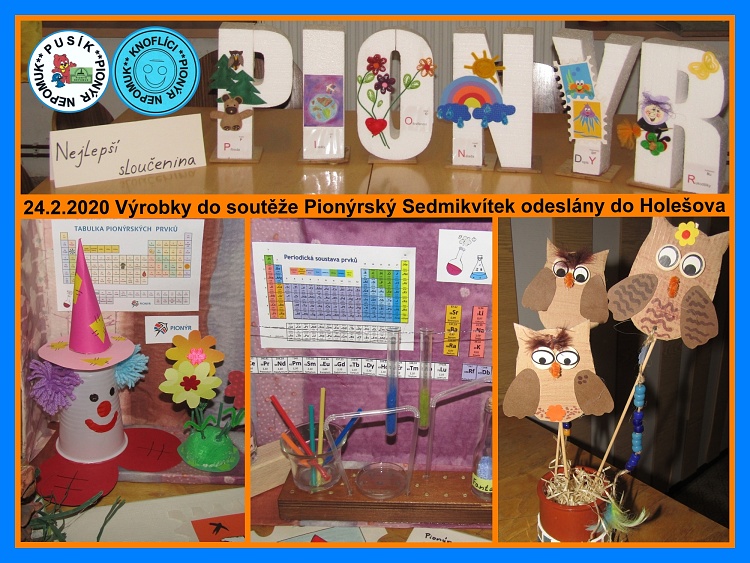 Zvládli jsme to a naše nejlepší výrobky z roku 2019-2020 jsme odeslali 25.2.2020 do republikové soutěže Pionýrský Sedmikvítek, který se uskuteční koncem března v Holešově na Moravě. Na výstavu a soutěž jsme odeslali našich sedmnáct výrobků se zaměření na pionýrskou tabulku prvků. Víte jakou jsme namíchali sloučeninu, samozřejně tu nejlepší s názvem Pionýr. Podívejte se na fotografie. Rozklikni nadpis.