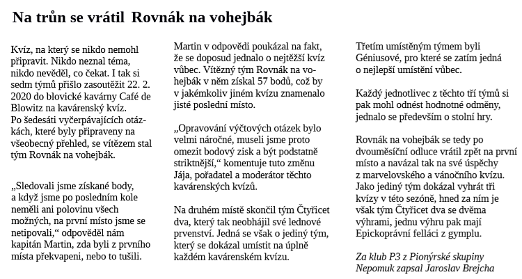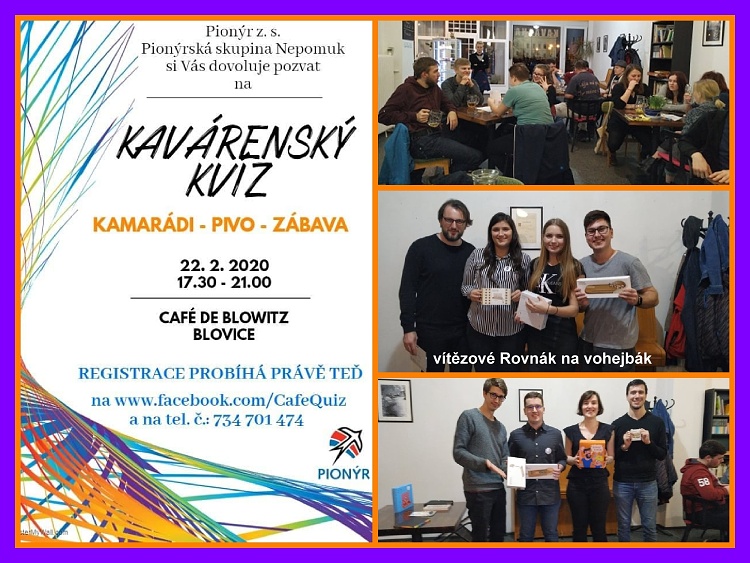 V Blovicích se dne 22.2.2020 uskutečnil únorový kavárenský kvíz a zúčastnilo 36 hráčů, kteří se proti sobě utkali v sedmi týmech. Na všechny čekal rekordní počet otázek, a sice 60 z 10 různých témat. Byl to první kvíz, na který se nikdo nemohl připravit, neboť veškerá témata nebyla předem oznámena. S nejlepším všeobecným přehledem se pak ukázal tým Rovnák na vohejbák, který s 57 body ovládl první místo. Obhájci z lednového kvízu, tým 42, pak skončil o čtyři body za nimi na druhém místě. Akce se zdařila a těšíme se na další kvíz, který se uskuteční 21. března 2020.*.Jára B.