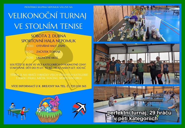 V předvelikonočním čase, v sobotu 2. dubna, se ve sportovní hale města Nepomuk uskutečnil další ročník tradičního velikonočního turnaje v ping-pongu pionýrského oddílu stolního tenisu.Zúčastnilo se jej 29 hráčů v pěti kategoriích – mladší a starší žáci/žákyně, muži.* Byly připraveny poháry pro vítěze jednotlivých kategorií a věcné dary s velikonoční tematikou – beránci, čokoládová vajíčka, pomlázky, ale i jiné věcné dary. Maskotem turnaje byl živý králíček dohlížející na řádný průběh turnaje ze svého výběhu. Vítězové kategorií jsou pak následující: Ml. žákyně: Zita Krejcarová St. žákyně: Anna Horová Ml. žáci: David Kotěšovec St. žáci: Tomáš Reitspies Muži: Viktor Usliber Příští Velikonoce se na vás budeme opět těšit. ** J.M. Brejcha
