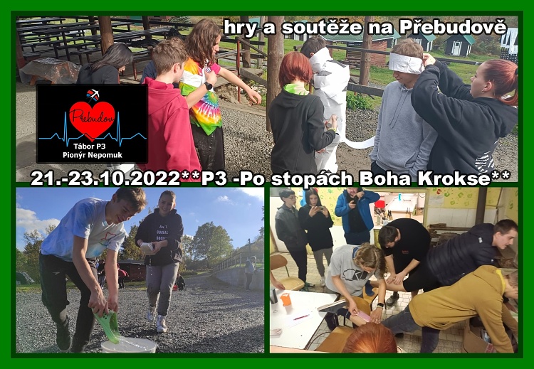 V sobotu (Přebudov 21.-23.10.2022) ráno nám počasí bohužel příliš nepřálo, což lehce ochromilo chod programu. Pokračovali jsme tak nejen seznamovacími, ale i dalšími hrami vevnitř v klubovně a doufali jsme v lepší počasí, aby se dostalo i na venkovní hry. To přišlo až po vydatném obědě. Děti plnily různá stanoviště ve dvou týmech, největší pomůckou byly samozřejmě kroksy.Po skončení této fázi hry jsme se přesunuli k běhu osamělého běžce, děti se tak z týmových soutěží přesunuly do soutěže každý sám za sebe. A nebyl to jen tak ledajaký běh, stanovišť bylo hned 32. Nejrychlejším běžcem se stal Matěj Míšek, který byl následován Luckou Machů a Michalem Hamplem. Všem patří veliká gratulace!Po skončení této hry nás k večeři čekaly řízky, po kterých jsme už zůstali nahoře v klubovně. Hlavním programem večera byly improvizační hry z Partičky. Nedělní ráno pak patřilo vyhodnocení a úklidu.**Jára B.