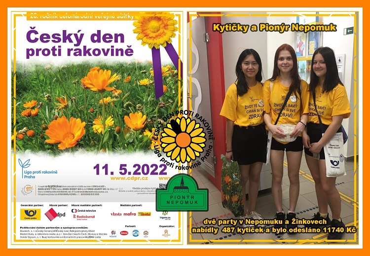 Pravidelně se zapojujeme do charitativní sbírky Český den proti rakovině. V květnu jsme ve dvou partách v Nepomuku a Žinkovech prodali 487 kytiček a na konto odeslali 11.740 Kč. Poděkování patří všem, kteří kytičku zakoupili a také našim organizátorům.