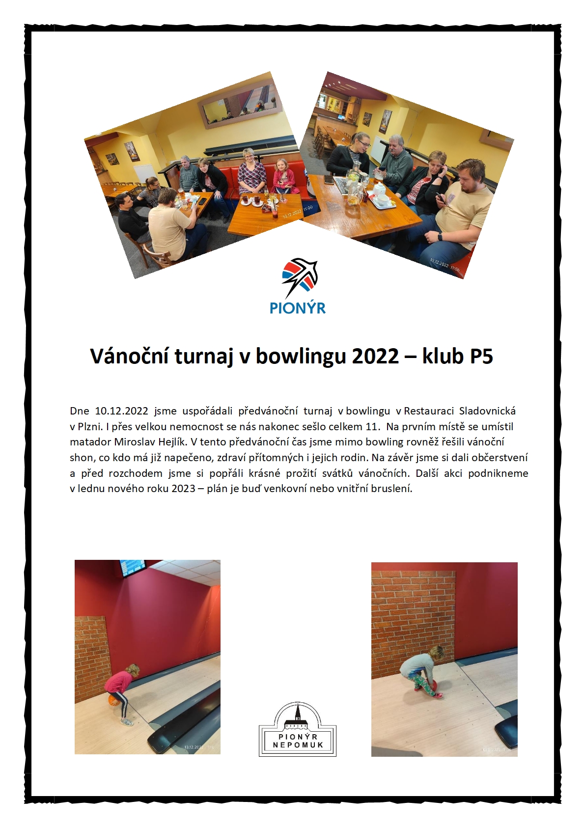 Dne 10.12.2022 jsme uspořádali předvánoční turnaj v bowlingu v Restauraci Sladovnická v Plzni. I přes velkou nemocnost se nás nakonec sešlo celkem 11. Na prvním místě se umístil matador Miroslav Hejlík. V tento předvánoční čas jsme mimo bowling rovněž řešili vánoční shon, co kdo má již napečeno, zdraví přítomných i jejich rodin. Na závěr jsme si dali občerstvení a před rozchodem jsme si popřáli krásné prožití svátků vánočních. Další akci podnikneme v lednu nového roku 2023 – plán je buď venkovní nebo vnitřní bruslení.**MJ