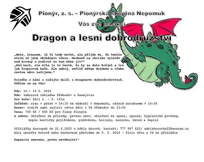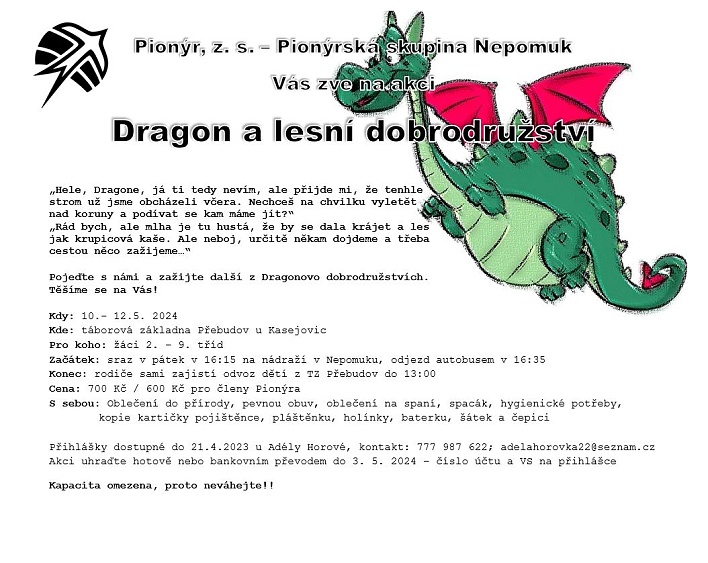 Pionýrská skupina Nepomuk připravila pro léto 2025 šest táborových běhů, tábor rodičů s dětmi a tři příměstské tábory.. O přihlášky na tábory si můžete napsat nebo zavolat na kontakty uvedené v letáčku. img